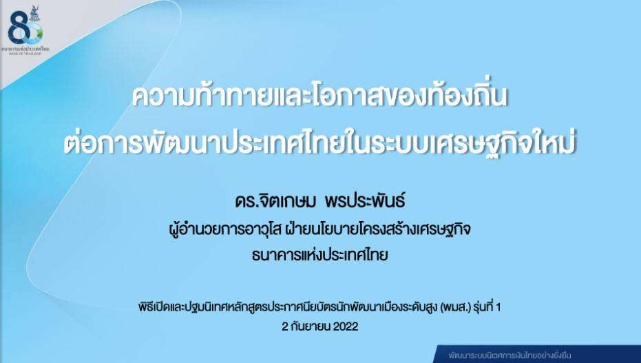 “ความท้าทายและโอกาสของท้องถิ่น ต่อการพัฒนาประเทศไทย ในระบบเศรษฐกิจใหม่” โดย นายจิตเกษม พรประพันธ์ ผู้อํานวยการอาวุโสฝ่ายนโยบายโครงสร้างเศรษฐกิจ ธนาคารแห่งประเทศไทย (ธปท.)