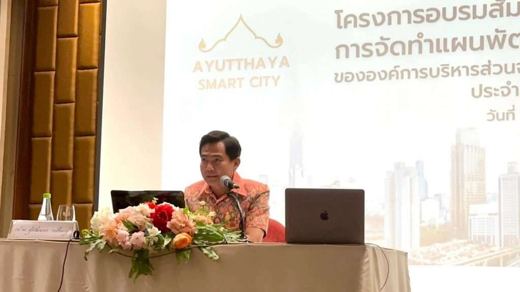 จากนั้นเป็นการบรรยายพิเศษ โดย อ.สุรเดช ทวีแสงสกุลไทย ผู้ร่วมก่อตั้งบริษัท ขอนแก่นพัฒนาเมือง (เคเคทีที) จำกัด ในหัวข้อ “ขอนแก่นเมืองอัจฉริยะน่าอยู่” โดยได้กล่าวถึง การเพิ่มการลงทุนในภูมิภาค ว่าต้องทำอย่างไรให้เกิดการพัฒนาแบบองค์รวม มองเรื่องของคนเป็นเรื่องที่สำคัญ พร้อมชูคำสำคัญ ว่ามีแต่คนบ้าเท่านั้นที่ทำแต่สิ่งเดิม ๆแล้วหวังผลลัพธ์ที่เปลี่ยนแปลงไป โดยได้ยกตัวอย่างการสร้างบริษัทขอนแก่นพัฒนาเมือง ว่าต้องสร้างจากโครงสร้าง และเป็นโครงสร้างการพัฒนาอย่างยั่งยืน สำหรับเมืองขอนแก่นนั้น ปัญหาแรกคือการเขียนแผนสมาร์ทซิตี้ แต่ไม่มีงบประมาณในการดำเนินงาน เราต้องทำการหางบประมาณเองโดยไม่ต้องพึ่งพาจากรัฐบาล มีการตั้งกองทุนผู้มีรายได้น้อยขอนแก่น เพื่อมีสิทธิ์เป็นผู้ถือหุ้น KKTS โดยเงินของผู้มีรายได้น้อยจะสะสมเพิ่มขึ้นเรื่อย ๆจากการลงทุนกลายเป็นเงินที่มีมากขึ้น ดั่งจะเห็นได้ชัดจากคำว่า “แก้จนลดความเหลื่อมล้ำ ด้วย KKTS” Research from Bank of Thailand” ขยายให้เกิดนวัตกรรมสวัสดิการเพิ่มขึ้น ลดความเหลื่อมล้ำเรื่องคุณภาพชีวิตที่ดีขึ้นและการศึกษาที่ดีขึ้น และการหางบประมาณในการดำเนินงาน เช่น ระดมทุนจากดิจิทัลและการเข้าตลาดหลักทรัพย์ SET SPAC Smart city เริ่มต้นด้วยทุนมนุษย์ และอย่างกิจกรรมในวันนี้การที่ อบจ. เริ่มมีการจัดอบรมโดยความความร่วมมือทางสังคม เพื่อเกิดการแลกเปลี่ยนพูดคุยกัน จึงถือเป็นเรื่องที่ดีมาก เพราะถ้าไม่มีความร่วมมือก็ทำไม่ได้ ซึ่งจังหวัดขอนแก่น ในอีก 17 ปี จะเกิดการพัฒนาเมืองอย่างมั่นคง มั่งคั่ง ยั่งยืน การที่จังหวัดพระนครศรีอยุธยา เรียกผู้มีส่วนเกี่ยวข้องหลายฝ่ายมาคุยกัน ทำให้เห็น vision ที่เห็นตรงกันช่วยกันคิดช่วยกันทำในครั้งนี้ การพัฒนาเมืองมรดกโลกอยุธยาสู่เมืองน่าอยู่ที่ชาญฉลาดจึงอยู่ไม่ไกลเกินเอื้อม