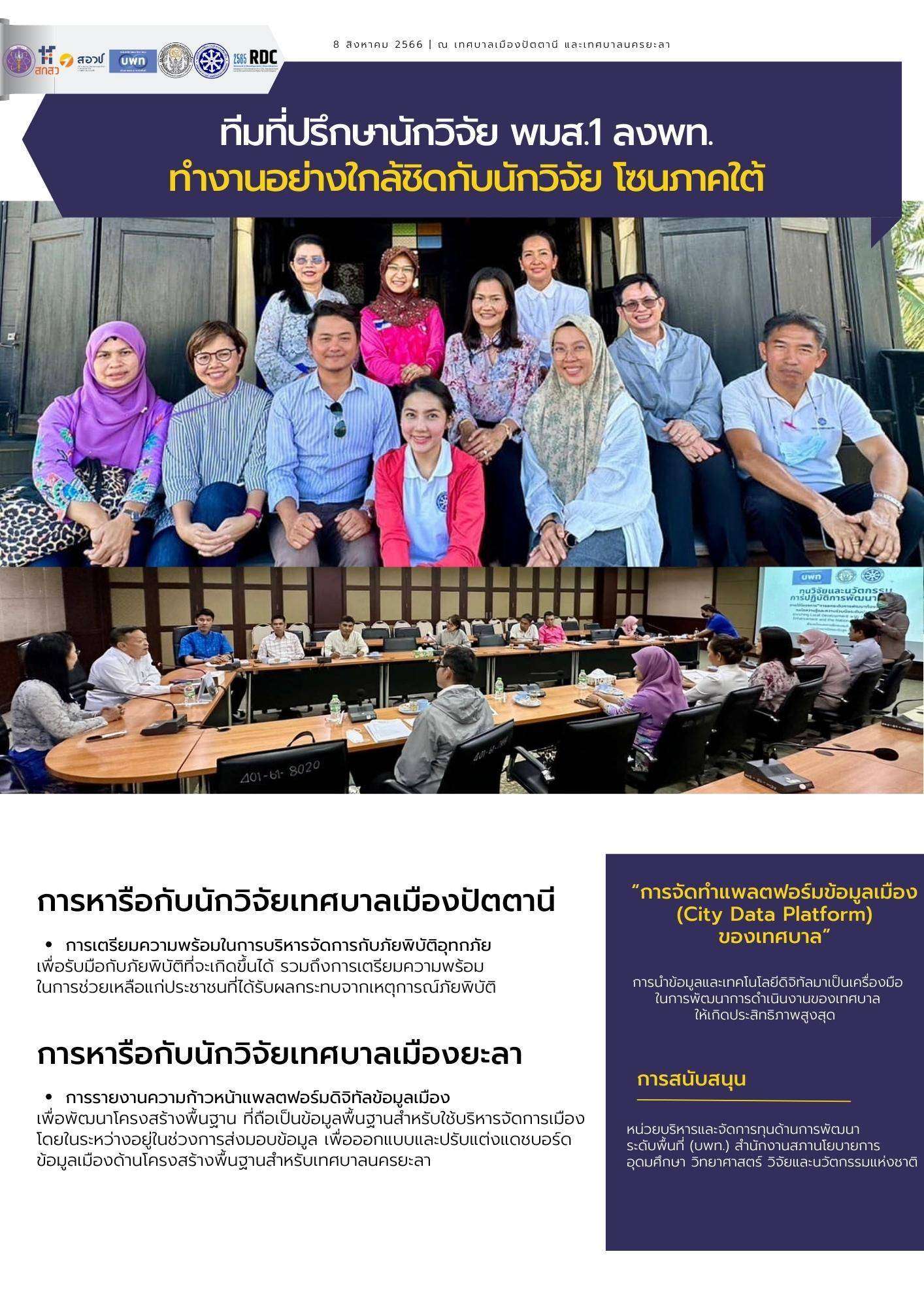 ทีมที่ปรึกษานักวิจัยหลักสูตรนักพัฒนาเมืองระดับสูง (พมส.1) ลงพื้นที่ภาคใต้ทำงานอย่างใกล้ชิดกับนักวิจัย เทศบาลเมืองปัตตานี และเทศบาลนครยะลา เพื่อประชุมหารือพัฒนาแพลตฟอร์มกลางที่สามารถพลิกโฉมเทศบาลให้เข้าสู่เทศบาลดิจิทัลร่วมกัน